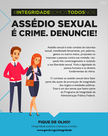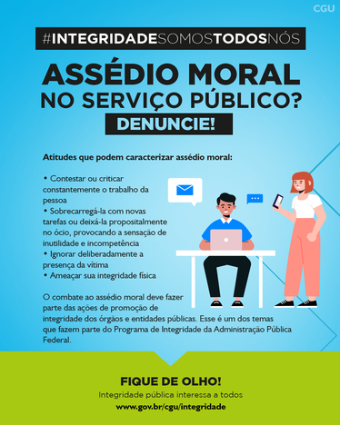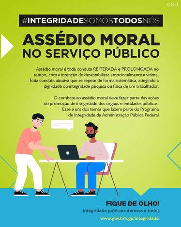 Nesta seção estão divulgadas peças de comunicação do tema "Assédio Moral e Sexual" desenvolvidas pela Controladoria-Geral da União (CGU). Aqui é possível fazer o download de cartilhas, cards e folders eletrônicos, bem como acessar vídeos com explicações sobre o assunto.